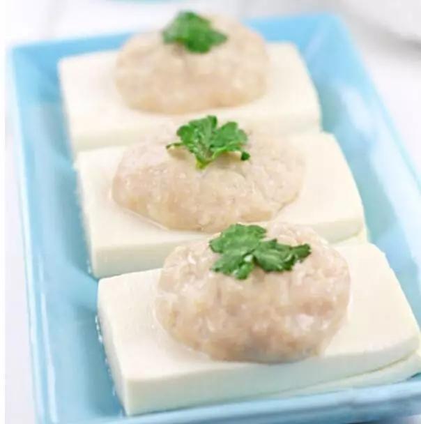 魚泥豆腐:草魚半條,去除頭尾魚骨,魚皮,洗凈剁成魚泥,然后將剁好的魚泥放到一個碗里,加入一個雞蛋清和姜末,攪拌一下再加入鹽、雞精、生粉、料酒、橄欖油、清水然后攪拌均勻,蒸鍋裝水燒開,然后把豆腐切成小方塊,放到蒸盤上,把魚泥捏成球狀稍稍按扁放到豆腐上,最后把裝好豆腐和魚丸的蒸盤放入蒸鍋中,大火蒸20分鐘即可。蒸好后在魚丸上面撒些芹菜或者蔥花作為修飾,色香味俱全。