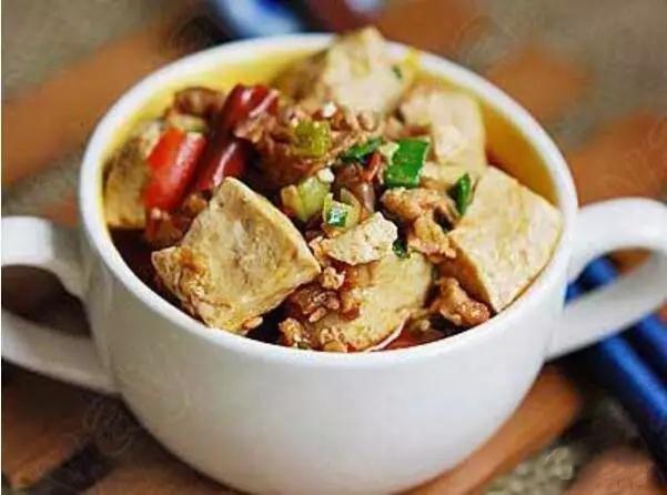 牛肉沫燒豆腐:將豆腐切成小塊,用開水焯過一遍,牛肉去筋切成肉沫,炒鍋燒開倒油,油燒熱后放入切碎的蔥花、牛肉沫煸炒,然后再放入焯水后的豆腐,加入鹽、糖、料酒、雞精、適量的水煮幾分鐘,起鍋前再加入勾芡好的淀粉即可。