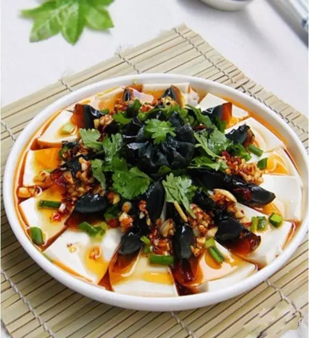 皮蛋拌豆腐:將油鍋燒熱,放入花椒炸出香味,撈出花椒留著花椒油,把嫩豆腐切片,擺放好在盤中,皮蛋洗凈切丁,放置在豆腐中央,取一小碗,加入鹽、味精、醬油、白糖、倒入花椒油調(diào)勻么成汁,最后澆淋在裝有豆腐和皮蛋上面,再淋上點辣椒油和香菜即可。